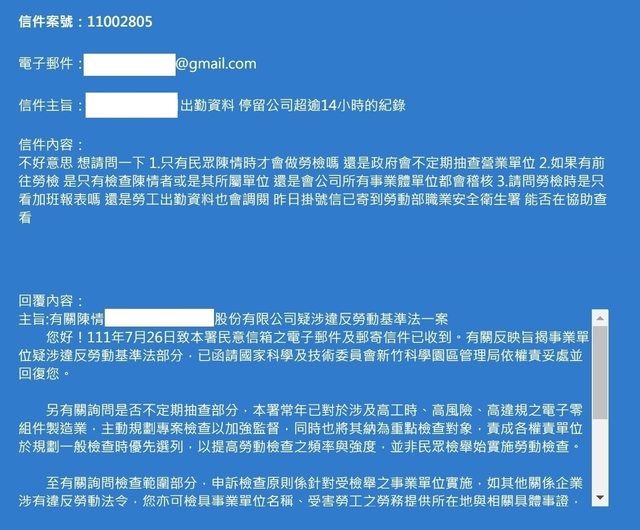 出勤超逾14小時資料 欲寄送勞動部職業安全衛生署