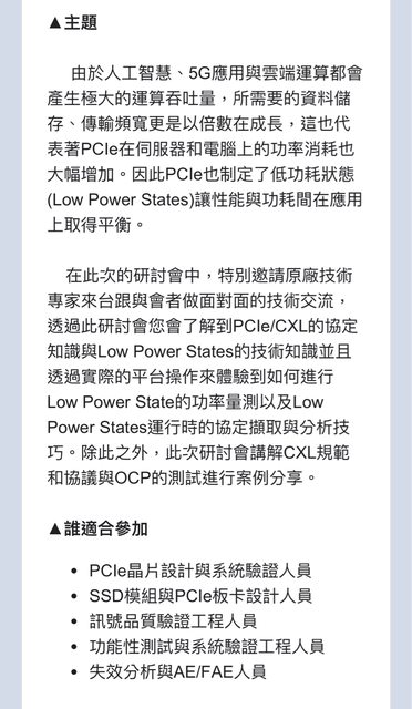 標題[情報] [免費研討會]NVMe/PCIe/CXL協議解析相關