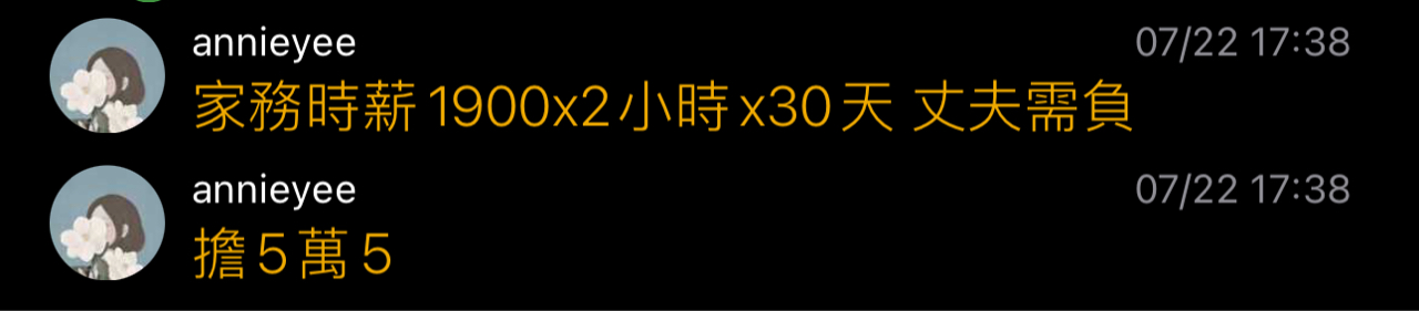 → annieyee : 家務時薪1900x2小時x30天 丈夫需負 1.200.107.103 07/22 17:38