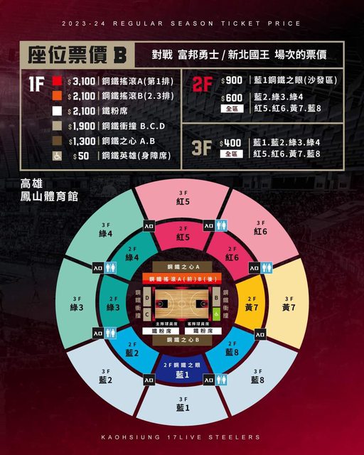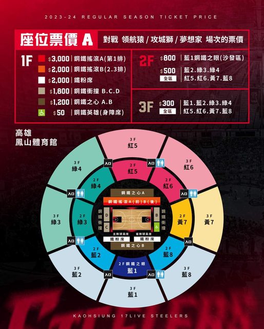 可以看到上季鋼鐵人不只因對手不同而有差別票價(鋼鐵英雄身障席例外)從最便宜300~400到最貴3000~3100,不過鑒於雄中體育館辦HBL比賽的經驗,光是要規劃鋼鐵英雄身障席就難度不小了,在已經被籃球場佔據了一樓絕大部分面積的一樓擠出規劃搖滾區的空間又更加困難,何況還有一堆行政行銷工作組如商品部門、雅典娜(鋼鐵人啦啦隊)之類的等待安排。