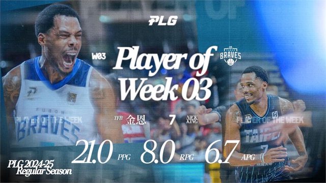PLG公布第三周最佳球員,由臺北富邦勇士洋將金恩(Nicholas King)卻屏中選。他在四天