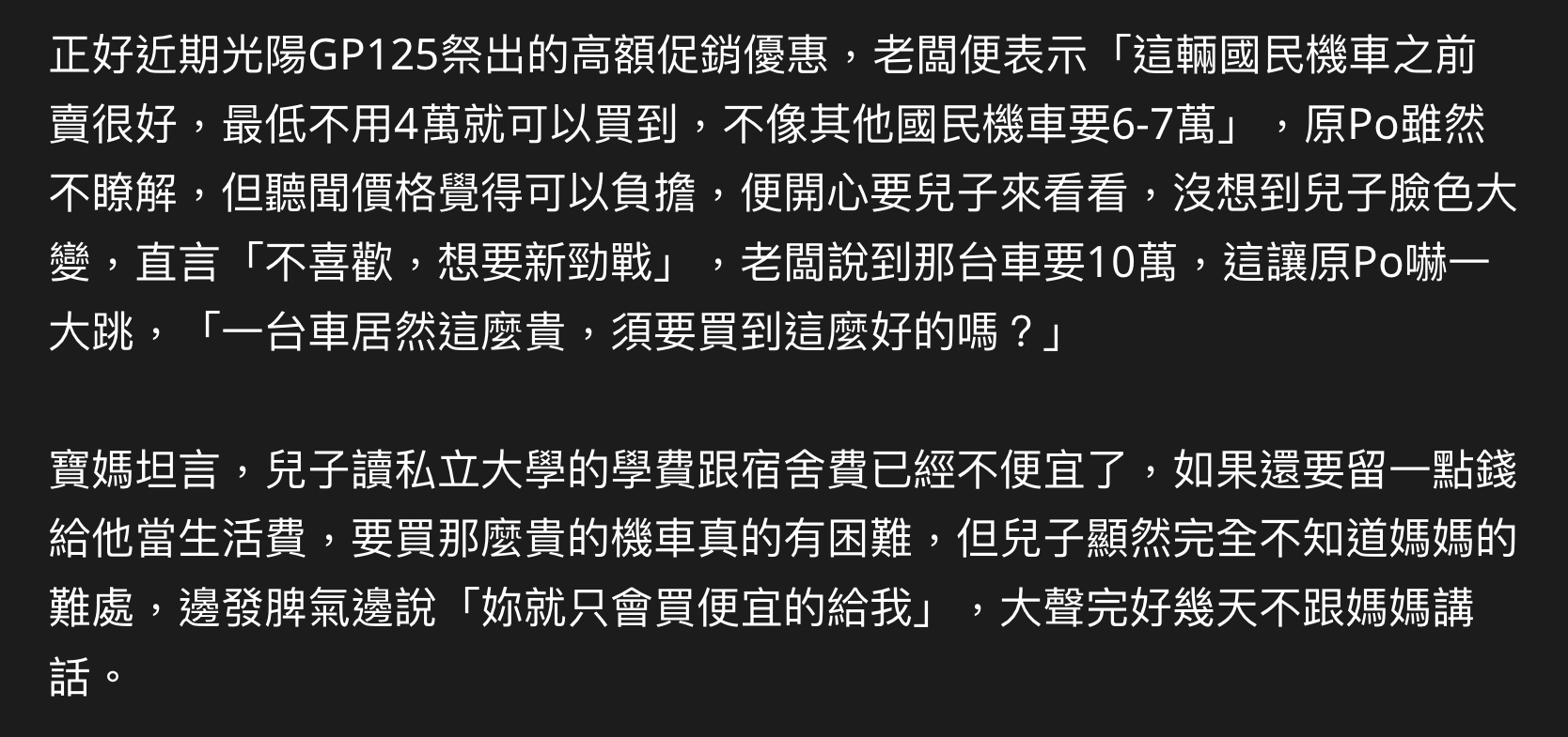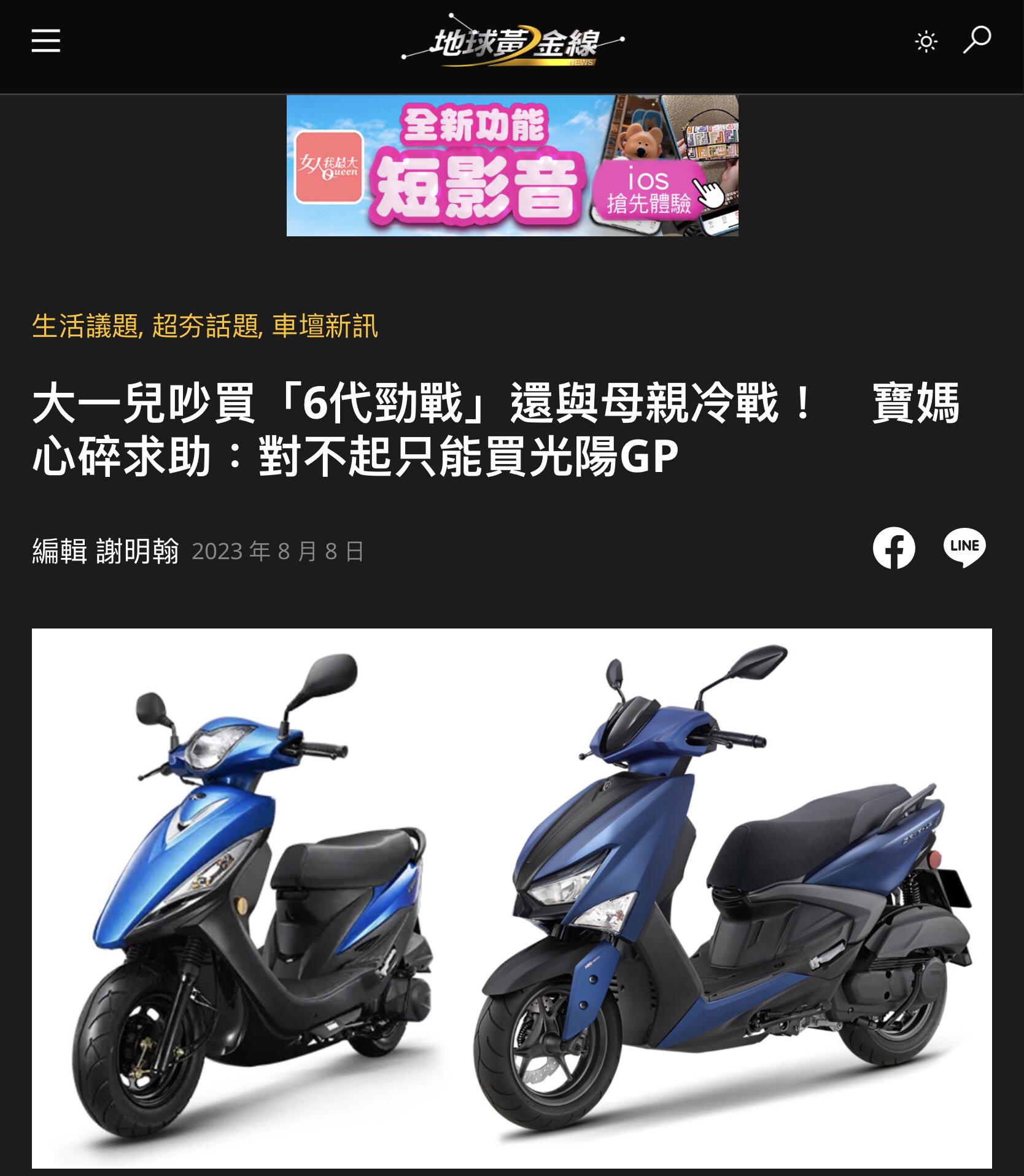 frozenmoon: 拒媽買GP堅持要新勁戰 他火大「沒女 58.115.116.83 08/15 11:48