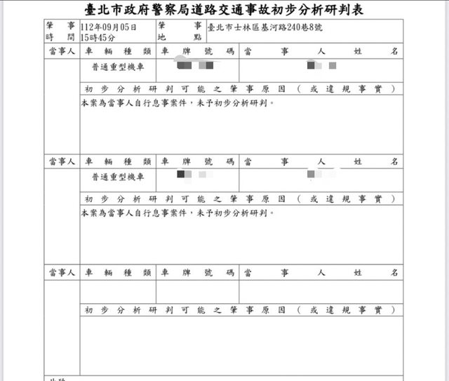 當下對方跟警察說他願意賠償修車費用和醫療費用, 警察問我是否同意,我說好,不知道是不是因為這樣所以事故初判表長這樣子。 https://i.imgur.com/gGUuvYc.jpg