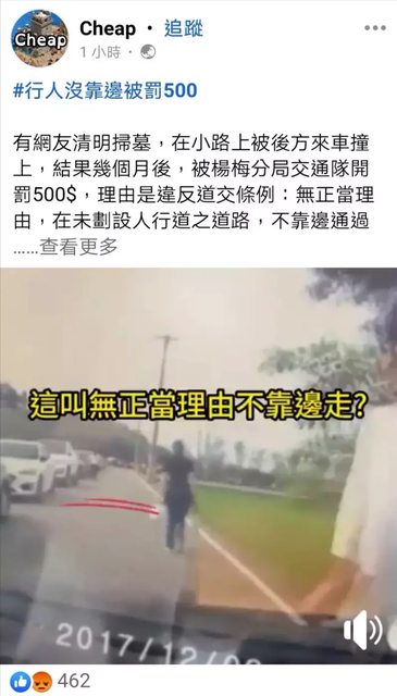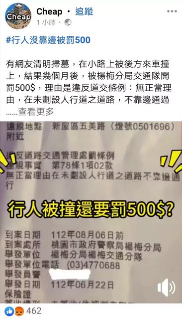 桃園市一名網友今年清明節步行掃墓被撞受傷、還挨罰500元,最近收到罰單,百萬網紅