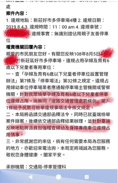 : 親愛的市民朋友您好,有關您反映108年8月5日**於新莊區好市多停車場,違規占用孕婦