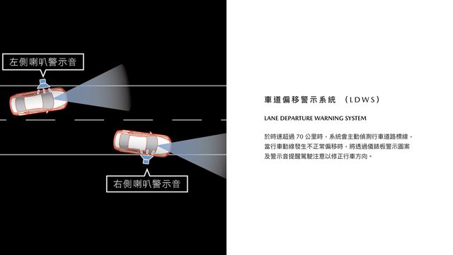 下面這張是「車道偏移警示系統 LDWS」,就是你講的那個。