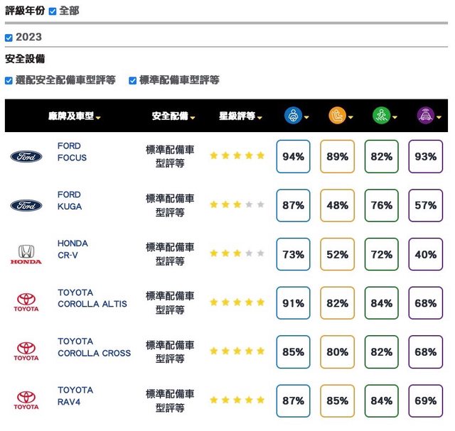 來看看總表,focus應該是目前國產安全王沒錯了。 輔助分數93%,結果一樣設備的Kuga 57% 就是第一排安全帶提醒居然沒生效?這是什麼鬼?缺料嗎?台福要不要出來解釋一下? https://i.imgur.com/2zVxAcn.jpg