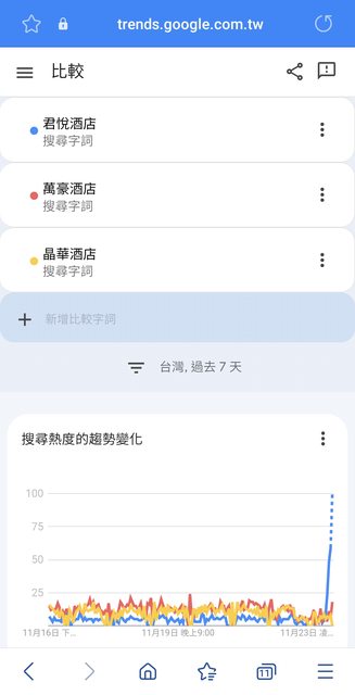 剛剛用google trend蒐了一下 過去七天台北高級飯店晶華、萬豪、君悅 搜尋熱度大概差不多, 甚至常常處於三家最低的, 但是今天某個時間開始, 君悅酒店熱度突然莫名其妙google trend筆直上升 甚至還加上向上不可預期的虛線 君悅酒店現在在想什麼??? 有八卦嗎? -- ※ 發信站: 批踢踢實業坊(ptt-club.com.tw), 來自: 223.136.65.46 (臺灣) ※ 文章網址: https://ptt-club.com.tw/Gossiping/M.1700727379.A.1B9