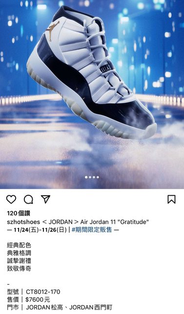 聽說明天到星期日 松高Air Jordan還有西門Air Jordan 開賣復刻Air Jordan 11 "Gratitude" https://i.imgur.com/yQXLtDC.jpg