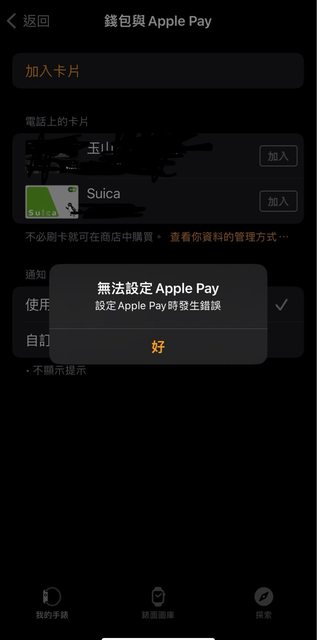 不論從iphone上watch app的錢包或watch上的錢包,都無法加入卡片,顯示「