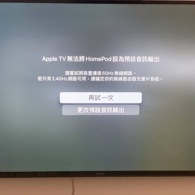 用2.4GHz頻段連接Apple tv 並更改預設音訊輸出為homppod立體聲喇叭,會出現下面的畫面,點再試一次就可以完成,但是會有單邊無法控制問題