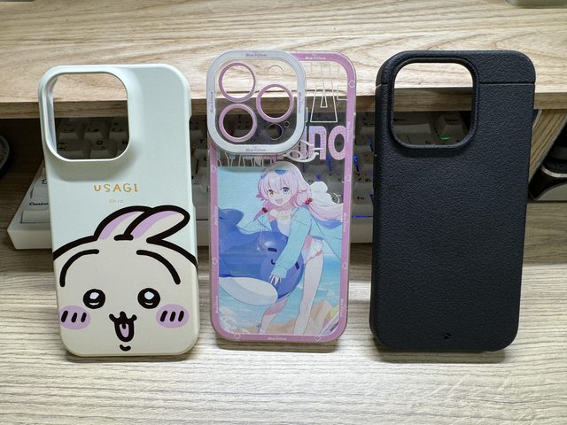 從左到右是韓國買的吉伊卡哇殼、淘寶買的蔚藍檔案殼、Caudabe SHEATH
