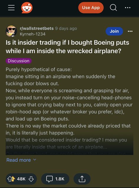 如果我在失事的飛機內購買波音的賣權, 算內線交易嗎? 純屬假設: 想像坐在飛機上, 突然間該死的門爆炸了。 現在, 當所有人邊尖叫邊想辦法吸進氧氣時, 你卻啟動降噪耳機以避免被身旁嚎哭的嬰兒干擾, 冷靜地打開你的Robinhood app(或你愛用的任何券商,隨便), 然後大量買進波音的賣權。 市場的價格不可能已經被此事影響, 畢竟它正在發生的瞬間。 這會被視為內線交易嗎? 我的意思是, 你真的就在那事故的飛機內部...... 另一方面, 你可以辯駁說你其實也在飛機外部, 鑑於門剛剛被吹走了...... 原文出處: https://i.imgur.com/R8yIWrR.jpg