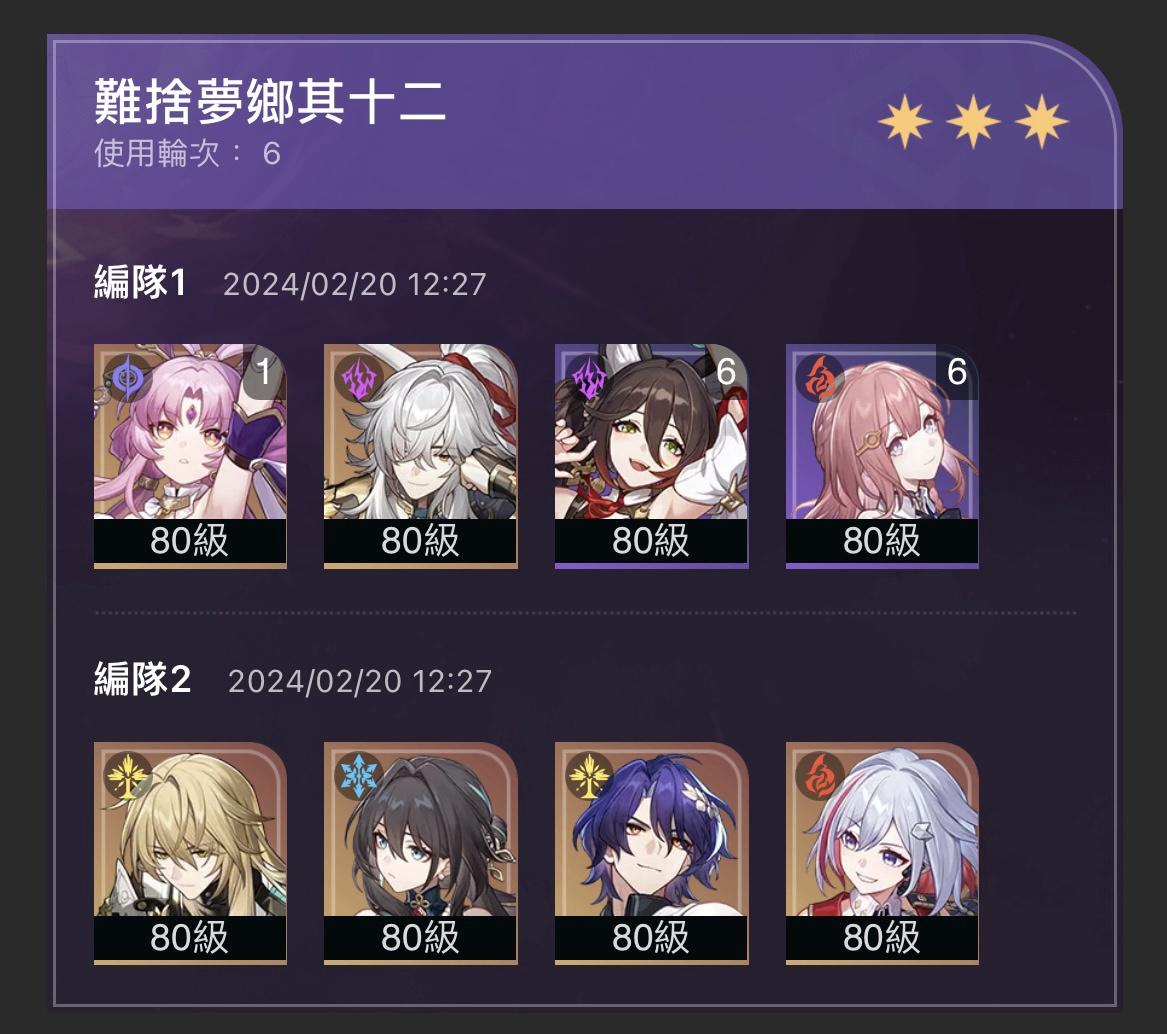 抽卡策略:只買月卡+只抽女角+不抽命座 限角只有鏡流是0+1其他全0+0。 有體感0+0越來越硬了,詞條不是最頂,但也有小畢業等級。 雖然也是凹到汗流浹背不過提供一個思路。 這期生存壓力不是特別大,但怪血厚到靠北 Dot隊不要拿去12下,雖然大家說12下做球dot 但0+0卡黑打兩條血單體刮起來真的太慢了。 如果你有10黑、01卡就另當別論 不如拿去12上輕鬆打,然後阮梅拆給12下靠鏡流大力飛磚。 題外話,玩到現在後悔沒抽藿藿,只能祈禱接下來忘卻跟這期一樣,靠白露或玲可還頂的 住。 之後應該會抽個花火0+0補齊量子隊,我用量子隊打薩姆後發現其實還算能打,可以當一 路通解。 然後之後如果有強女主C抽個0+1。不要膨脹的太快應該還能爽一陣子...吧 -- ※ 發信站: 批踢踢實業坊(ptt-club.com.tw), 來自: 36.236.131.53 (臺灣) ※ 文章網址: https://ptt-club.com.tw/miHoYo/M.1708501249.A.BFA