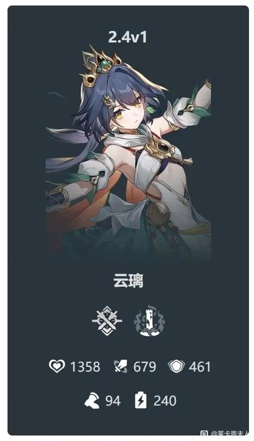 雲璃 (5★ 毀滅,物理) 屬性 生命值: 1358 攻擊力: 679 防禦力: 460 速度: 94 嘲諷: 125 晉升資料:信用點 (x308000),蓄夢元件 (x15),流夢閥門 (x15),星際和平工作證 ( x65),造夢馬達 (x15) 行跡資料:信用點(x3000000),命運的足跡(x8),步離犬牙(x18),狼毒鋸牙(x69),月狂 獠牙(x139),同願的遺音(x12),蓄夢元件(x41),流夢閥門(x56),造夢馬達(x58) 星魂 風霜劍不鏽:直覺·斬和直覺·屠的傷害增加20%,直覺·屠的額外傷害命中增加3次。 初光破曉:回合結束時,雲璃的暴擊率增加18%,持續到下回合開始。 工匠鐵歌:當雲璃因追加攻擊造成傷害時,忽略目標20%的防禦力。 刀劍琴談:使用終結技後,如果下一個行動的單位是敵方單位,則會觸發直覺·屠,無論 其是否針對雲璃,且終結技提供的格擋效果不會消失,持續到下個回合結束。此效果每回 合只能觸發1次。 行跡 屬性:攻擊力 (28%),生命值 (18%),暴擊率 (6.6%) 火輪:受到攻擊時,雲璃會額外恢復15點能量。 鎮魔:在格擋狀態下,抵抗控制類減益效果,且所受傷害減少20%。 真裂:使用追加攻擊時,雲璃的攻擊力增加30%,持續1回合。 技能 【普攻】風旋飛轉 對單一敵人造成等同於雲璃攻擊力50%(130%)的物理傷害。 【戰技】刃生震盪 恢復等同於雲璃攻擊力20.0%(35.0%)加50(256)的生命值,並對單一敵人造成等同於 雲璃攻擊力60%(150%)的物理傷害,對其相鄰的敵人造成等同於拓荒者攻擊力30%(75% )的物理傷害。 【終結技】地縛·靈斷 消耗:120點能量。 消耗120點能量。雲璃獲得格擋並嘲諷所有敵人,持續到下一個盟友或敵方單位的回合。 格擋啟動期間,雲璃的暴擊傷害增加60%(120%)。當格擋期間觸發追加攻擊天賦效果時 ,會轉換為追加攻擊直覺·屠效果,並解除格擋。如果在格擋期間觸發追加攻擊效果,當 效果結束時,雲璃將立即對隨機敵人目標發動追加攻擊直覺·斬效果。當施加直覺·斬時 ,將導致下一個直覺·斬變為直覺·屠。 直覺·斬:對目標造成等同於雲璃攻擊力144%(288%)的物理傷害,並對鄰近目標造成等 同於雲璃攻擊力72%(144%)的物理傷害。 直覺·屠:對目標造成等同於雲璃攻擊力144%(288%)的物理傷害,並對鄰近目標造成等 同於雲璃攻擊力72%(144%)的物理傷害,然後額外造成6次傷害。每次傷害對隨機單一敵 人目標造成等同於雲璃攻擊力48%(96%)的物理傷害。透過此能力造成的傷害視為終結技 傷害。 【天賦】閃鑄 當雲璃受到敵人目標攻擊時,立即對攻擊者進行追加攻擊,對目標造成等同於雲璃攻擊力 60%(150%)的物理傷害,並對相鄰目標造成等同於雲璃攻擊力30% (75%)的物理傷害。 【秘技】後發製人 獲得守護效果15秒。透過攻擊敵人或受到攻擊進入戰鬥時,立即對隨機敵人目標施加直覺 ·屠,並增加此攻擊的傷害80%。 https://i.imgur.com/wLaWXRq.png