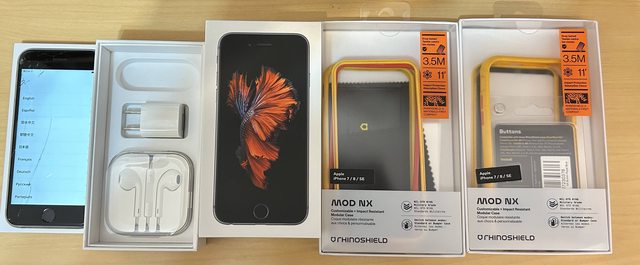 盒裝內含:手機、全新耳機、二手豆腐頭、盒子、犀牛盾保護殼兩個