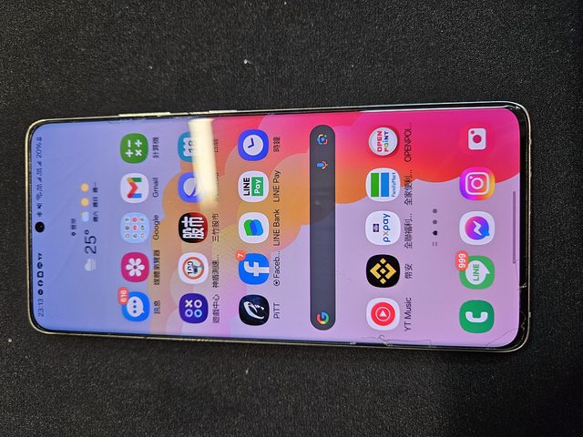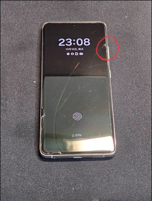 2.螢幕玻璃破裂,紅圈為撞擊點,因為目視有裂痕,但玻璃貼沒破,所以判斷是螢幕玻璃破