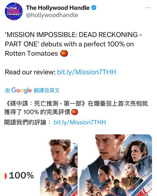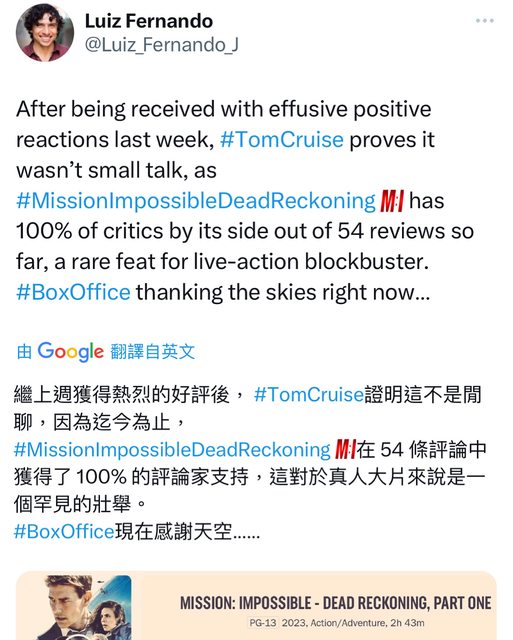 推 f1rc : 不管評價,阿湯哥的電影就是看爆!07/06 00:43