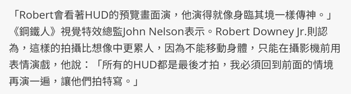 推 qawsed999 : 拍鋼鐵人內部的鏡頭其實不輕鬆喔 小勞勃道尼也覺得 08/11 12:36