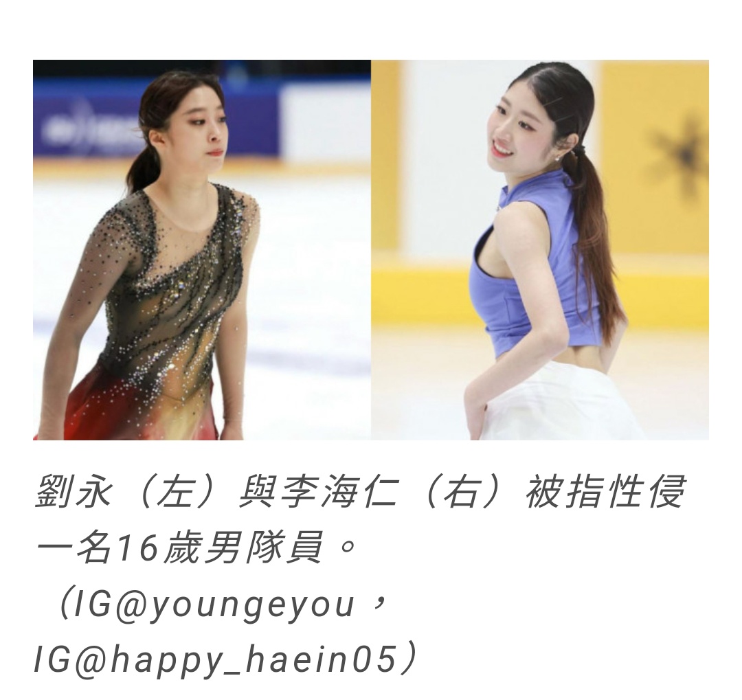 韓國花滑隊醜聞曝光!知名女選手性侵男隊友被禁賽 新浪新聞 2024年06月23日 12:36   來源:橙柿互動   今天上午,#韓國花滑醜聞#沖上熱搜榜。   據多家韓媒報導,韓國花滑隊上個月在海外集訓期間,有兩名選手多次酒店內飲酒, 還被發現性侵害他人。韓國滑冰協會發佈聲明表示,已對此事進行調查,對涉事選手處罰 禁賽。   首先是兩名花滑女運動員A和B集訓期間酗酒,韓國冰協對此進行了調查,發現還有其 他不當行為。據稱,女選手A邀請了男選手C到她們的住處,並做出了讓C感到不適的性行 為,另一名女選手B則在未得到A同意的情況下拍攝了這一過程,並發給了C。   韓國冰協針對此事召開了會議,目前得出的處罰結果是,C進入女運動員宿舍違反管 理規定被批評教育,A處罰禁賽3年,B處罰禁賽1年,主管教練D因疏於管理被停職三個月 。A的經紀公司回應此事時表示,暫時無法聯繫到球員,無法發表官方聲明。   韓媒透露,韓國冰協方面認為兩名女選手的行為非常嚴重,並決定將其上報體育道德 中心。這兩名選手在收到正式處罰前可以提出上訴,如果在重審中她們的行為被證實,那 麼所接受的處罰將對她們的職業生涯產生很嚴重的影響。目前得到的消息是,B要求重審 ,A尚未決定。   另據韓網爆料稱,A選手是2023年花滑世錦賽女單銀牌得主李海仁(19歲),B是2019 年花滑四大洲錦標賽女單銀牌得主劉永(20歲),C是2024年花滑青年世錦賽男單金牌得 主徐玟圭(16歲)。若處罰最終得到確認,這將意味著禁賽3年的李海仁將無緣2026米蘭 冬奧會。 https://s.yam.com/EXzkz -- ※ 發信站: 批踢踢實業坊(ptt-club.com.tw), 來自: 180.176.190.76 (臺灣) ※ 文章網址: https://ptt-club.com.tw/sex/M.1719150707.A.FCF