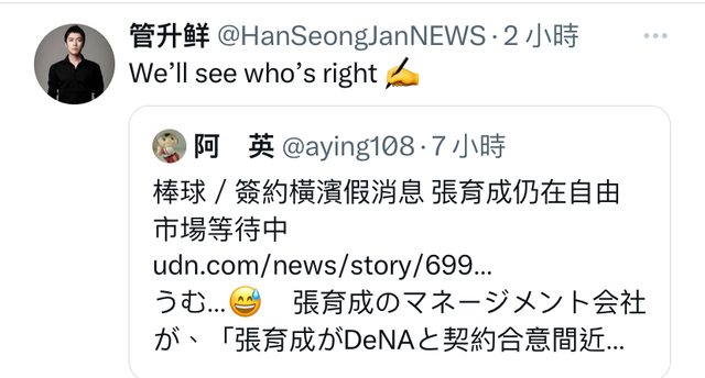 推 osvaldo4040: 剛剛解除了他封鎖去看一下,他現在又說DeNA要賣海星 01/14 22:08