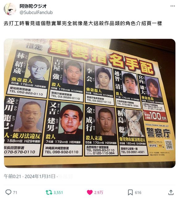 因為桐島聰被捕新聞大量報導導致懸賞單照片在他旁邊的金成行也大量曝光