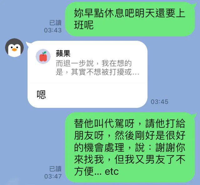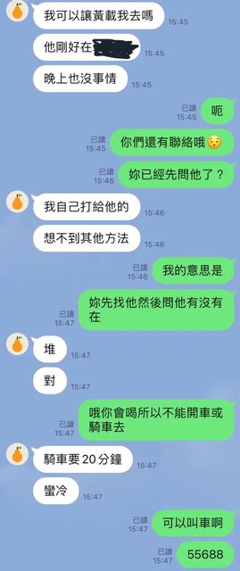 : -女友的解釋是她只想搭順風車(張家住南部),然後只是想關心張的近況,並沒有要做甚