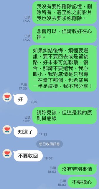 : (雖然是交往前的事,但我很介意所以有跟女友說過我沒辦法接受他們還有聯繫)