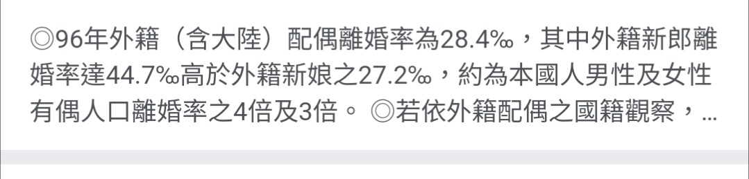 → etiennechiu : 統計數據顯示,外籍配偶離婚率是本國配偶離婚率的3 10/20 13:50