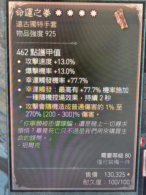 物 品:四太古命運手特效270(請明列物品名稱與詳細數值)
