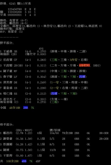 標題[情報] G245 獅5:1兄弟 全場數據box