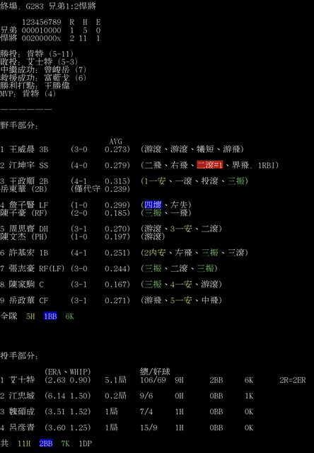 標題[情報] G283 兄弟1:2悍將 全場數據box