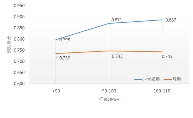 不管打者強度如何,觸擊其實都不太好。OPS+越高的打者正常揮擊和觸