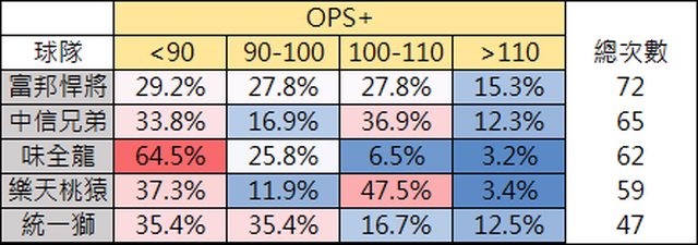 打。OPS+>110的比例偏低的主因是富邦根本沒幾個這樣的打者。