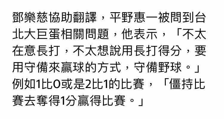 → Sfltnarud: 平野:沒有想過靠長打贏球 要靠短打 04/27 21:56