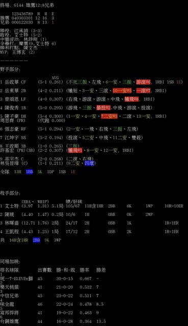 標題[情報] G144 雄鷹12:8兄弟 全場數據box