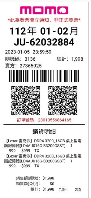 2.捷元代理記憶體終保,今年1月momo購入