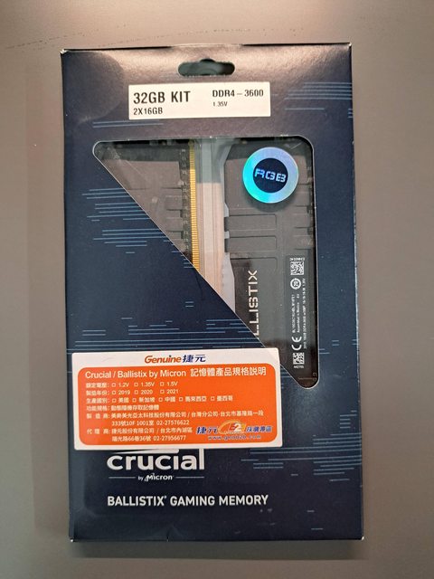 3.美光BALLISTIX RGB 32GB KIT DDR4-3600 (16*2)