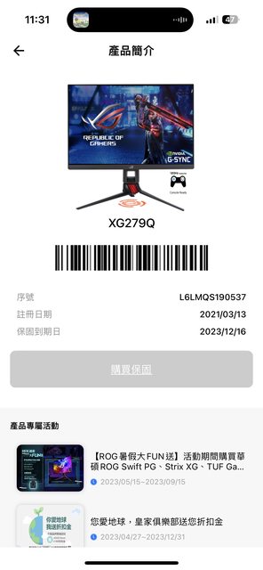 ◎硬體型號: ASUS ROG XG279Q(禁止販售未拆封之物品,贈品、獎品、RMA品、電腦相關