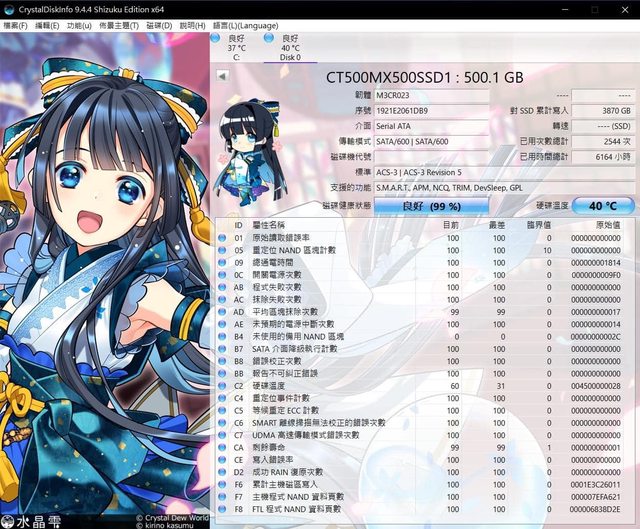 Speccy顯示的MX300因健康度偏低故換成MX500健康度99%