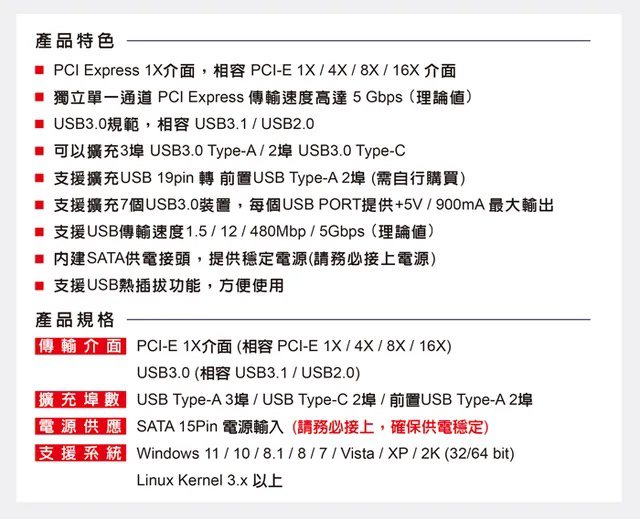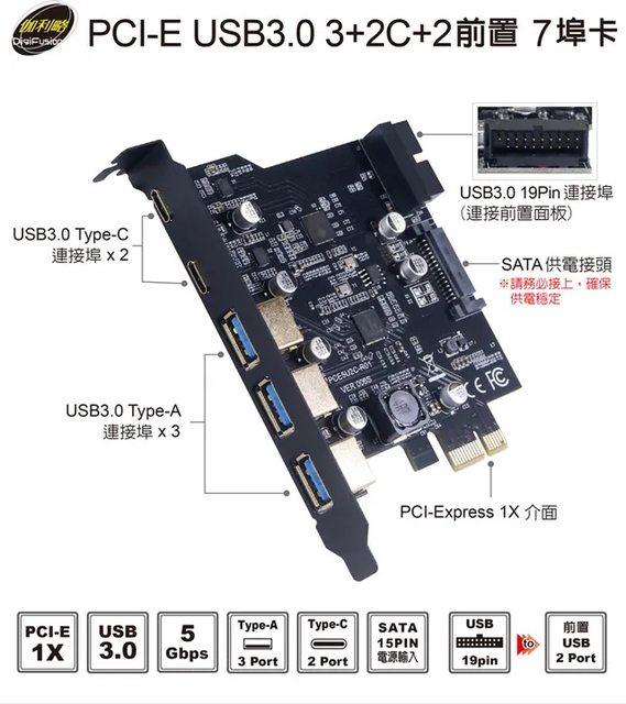 ◎硬體型號:伽利略 PCI-E USB3.0 7埠擴充卡(3A+2C+前置2A)