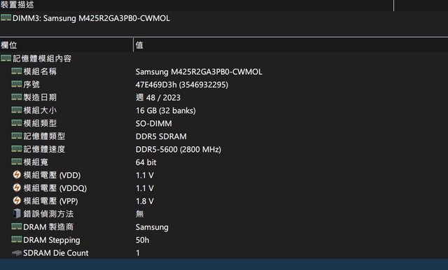 ◎硬體型號: 三星 sodimm ddr5-5600 M425R2GA3PB0-CWMOL