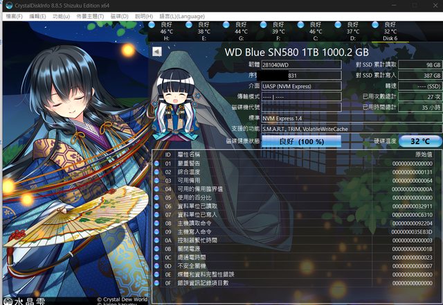 S.M.A.R.T狀態請見下圖,基本上還很新。兩條不拆售。其中一條盒子有點撕破。
