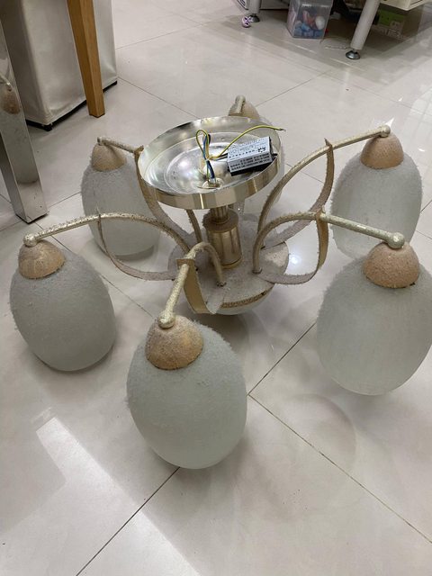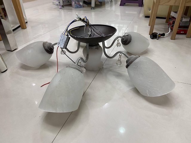 物品項目:舊的堪用但布滿灰塵的吊燈2組,有四段式電子控制開關