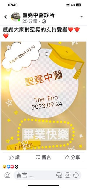 請問在新竹市武陵路上的聖堯中醫在FB上貼出9/24畢業了