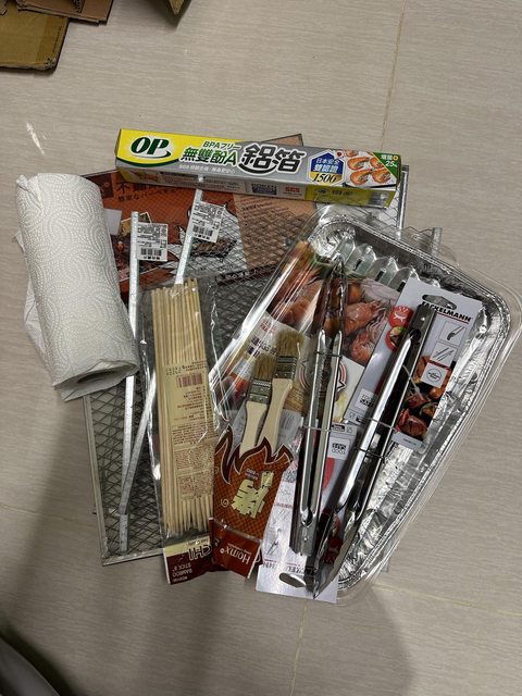 1. 烤肉用品(鐵網*4/夾子*2/烤肉刷*2/叉子數隻/鋁箔一捲/半捆紙巾)