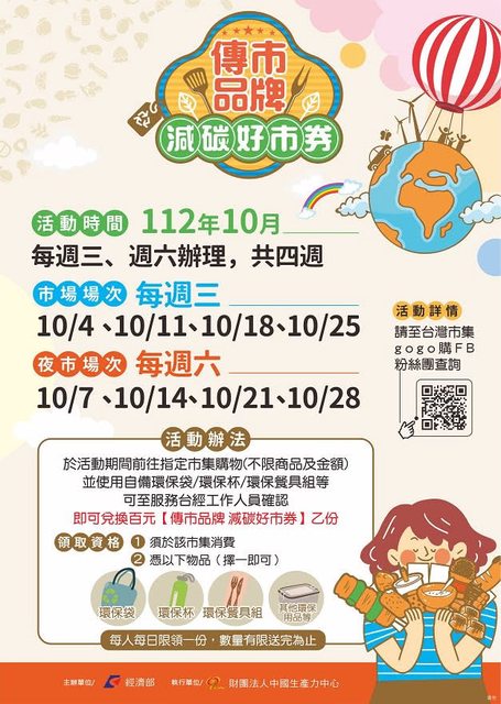 活動指定傳統市集消費(不限商品及金額),並使用自備環保袋/環保杯/環保餐具組等,至