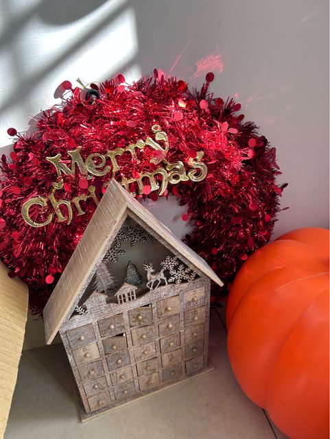 一個有幾格抽屜卡住的木製聖誕倒數日曆