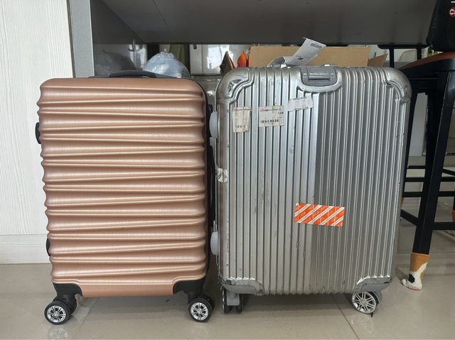 物品狀態:玫瑰金少用近全新,銀色行李箱輪子稍有脆化,無法滑順拖行,箱體本身沒有