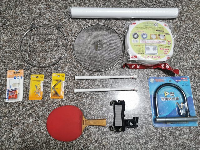 1.瑜珈墊、保溫袋、白報紙(烘焙用)、機車防盜鎖(新)、機車手機架、桌球拍、牙線